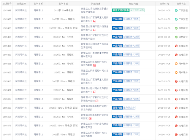 快科技3月6日消息,汽车第三方投诉平台车质网显示,近期,阿维塔12遭到车主们的集体投诉,投诉原因普遍为“厂家隐瞒重大更新,背刺老车主”。