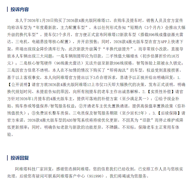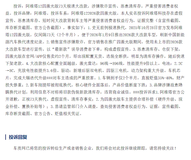 一位投诉车主称,阿维塔12四激光版73天极速大改款,涉嫌欺诈宣传、恶意清库存,严重侵害消费者权益。